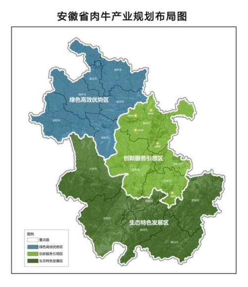 《規劃》立足安徽資源稟賦、環境承載能力、產業基礎和區位條件等因素,提出以良種繁育為引領,以標準化規模養殖為基礎,以產業融合為重點,以科技裝備為支撐,以種養循環為紐帶,以“雙招雙引”為抓手,著力擴規模、提質量、延鏈條、創品牌、增效益,培育千億級綠色食品肉牛產業,把安徽打造成中原高品質肉牛種源供應基地和長三角優質肉牛生產加工供應基地,為推動安徽農業強省、美好安徽建設貢獻力量。《規劃》運用畜禽糞污土地承載力測算方法和草畜平衡測算模型,科學開展資源環境承載能力分析,深入開展市場潛力及全國肉牛產業發展趨勢分析,多維度研究提出2023—2030年安徽肉牛產業發展目標。《規劃》堅持因地制宜、分類施策,統籌考慮區域功能與開發程度,將全省劃分為皖北、皖中、皖南三個肉牛產業優勢區,提出差異化發展策略,協調推進全省肉牛產業高質量發展。《規劃》共謀劃八大類23重點項目,總投資419.05億元,并通過“自上而下”和“自下而上”相結合的方式,提出首批推進的項目清單,進一步提高了規劃的針對性和可操作性